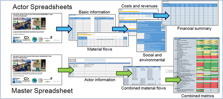 A ferramenta tem como dados de entrada informações sobre a geração, composição e coleta de resíduos dentro de uma área do estudo – município, região ou bairro e o fluxo de materiais entre os diferentes atores no sistema de gestão de resíduos: os diferentes geradores de resíduos, os diferentes coletores (oficiais ou agindo de maneira informal) de cada um dos resíduos e a destinação que cada um dá ao resíduo que coleta e ao rejeito que produz.